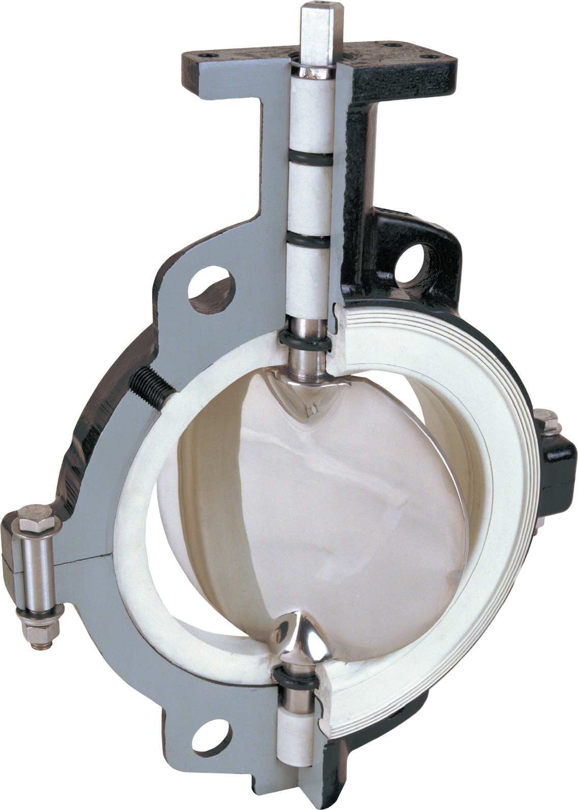 Closed, unsealed As the valve rotates into the closed position, the disc makes only casual contact with the seat, reducing friction, wear and torque requirements. Closed, sealed After the valve is closed, the seat inflates against the disc providing more sealing surface and an even pressure distribution against the disc. Open, unsealed Before the valve opens, the seat is first deflated. The disc is then free to rotate to the open position. |