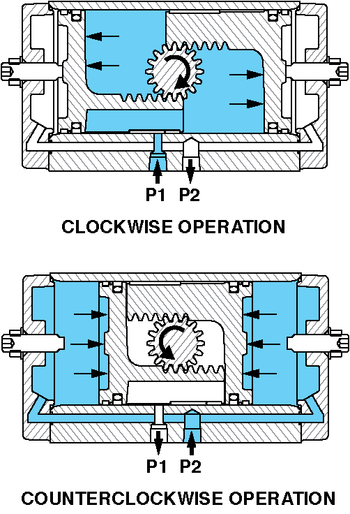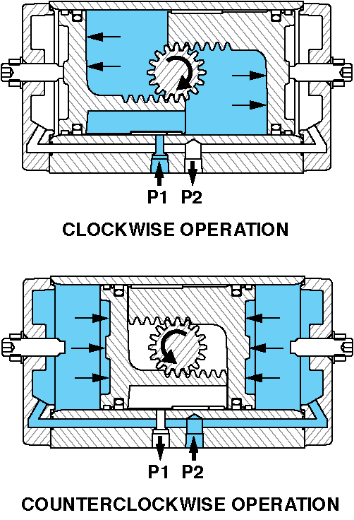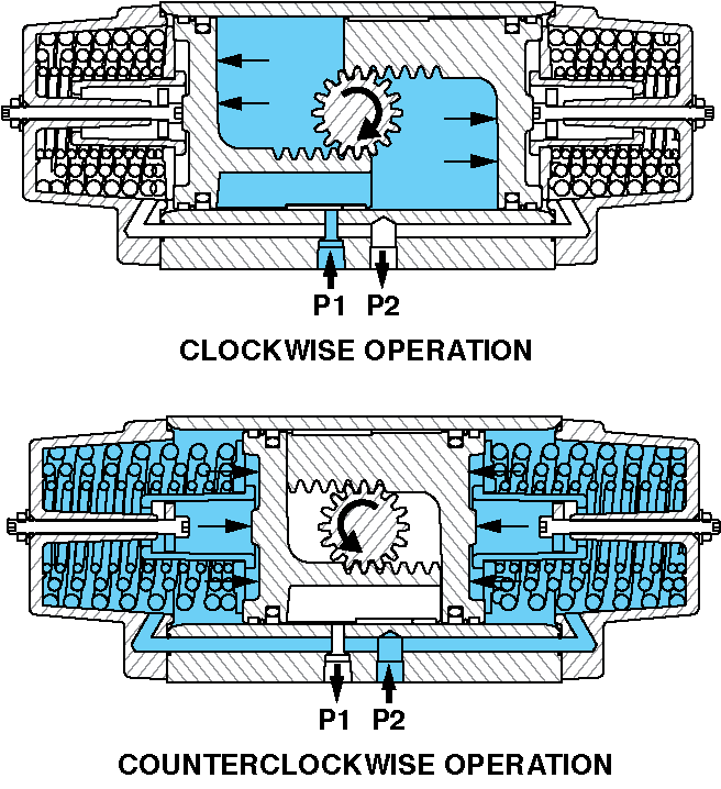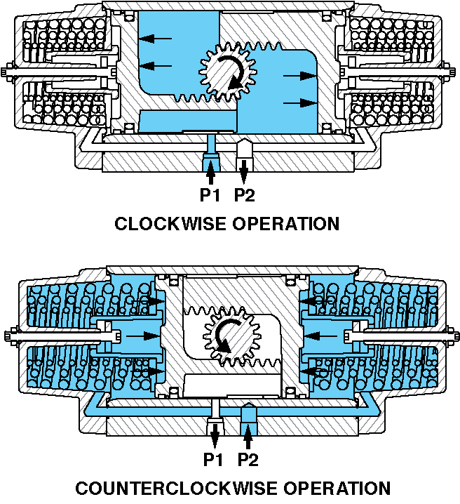 For clockwise operation, Port 2 (P2) is open to atmosphere and air pressure is directed to Port 1 (P1). As the pistons move apart, the pinion rotates clockwise. The linear movement of the pistons is converted to rotary motion by the piston racks and the output pinion gear.